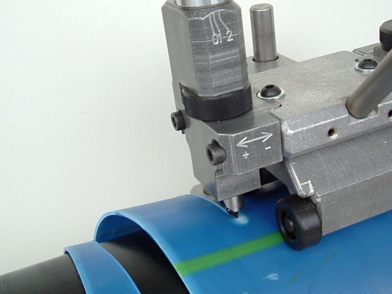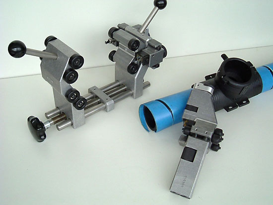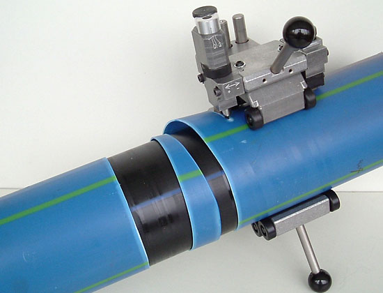 - Abmanteln des mechanischen Schutzmantels in der Rohrmitte für das Aufschweißen von Sattelstücken und Anbohrschellen. Bei Größe M1 mit Verwendung eines Adapters, bei Größe M2 im Lieferumfang enthalten.